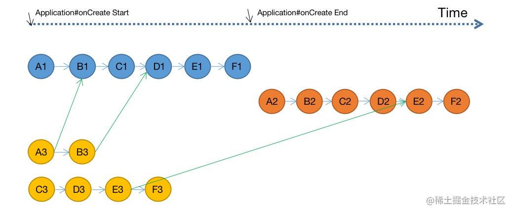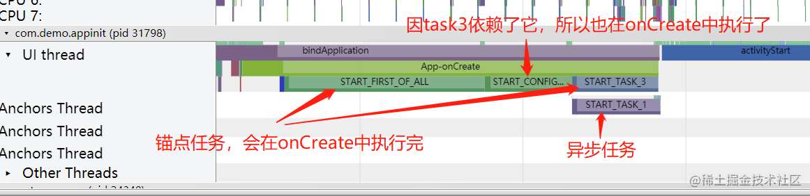 在Demo中,START_TASK_3、START_FIRST_OF_ALL是锚点任务,START_TASK_3 depend on START_CONFIG_PRELOAD,任务图是在Application的onCreate中执行的,所以这三个任务会在onCreate中执行完毕,如下图: