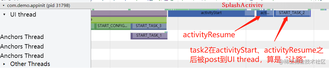 首先异步执行当然会减少启动时间,那如果全部都是同步执行呢?经过测试,启动过程也是变快了的。最终启动变快的原因就在于这个sHandler.post(task);(sHandler的Looper是主线程的Looper)。当每个task执行时,会post到主线程的消息队列的末尾,相当于不是立即执行,而是等待主线程现有的任务执行完了才执行,相当于给App启动“让路”。除了锚点任务会优先保证执行,任务链后面的task无法保证任务链中的同步关系,因为都是通过post;