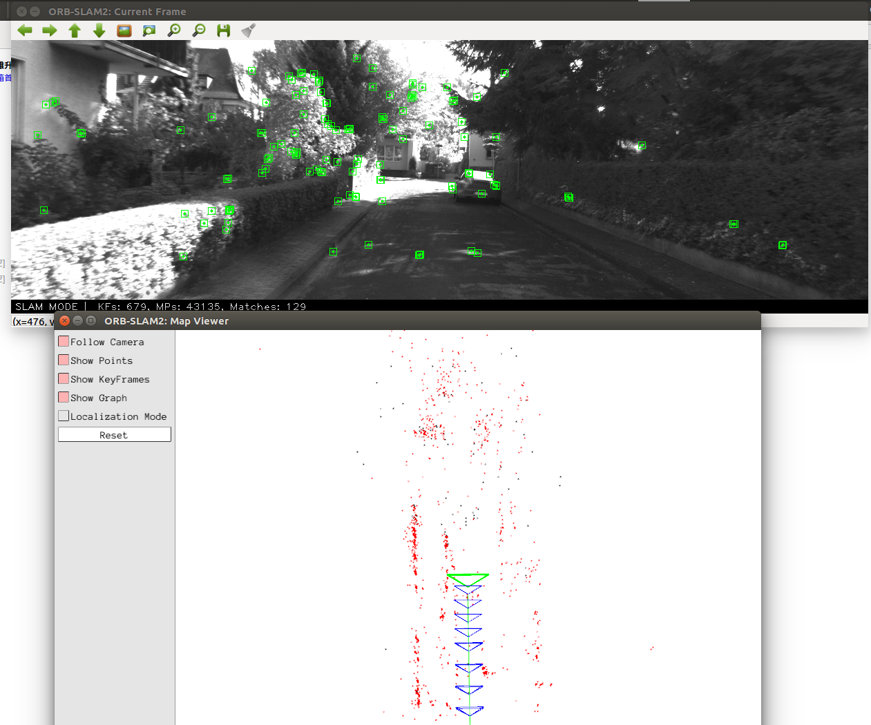 ORB-SLAM2代码阅读笔记(一):从mono_kitti单目运行开始 中用KITTI的单目数据集运行ORB-SLAM2系统的运行效果,我们看到的地图显示界面就是VIew线程来负责显示的。如下图所示: