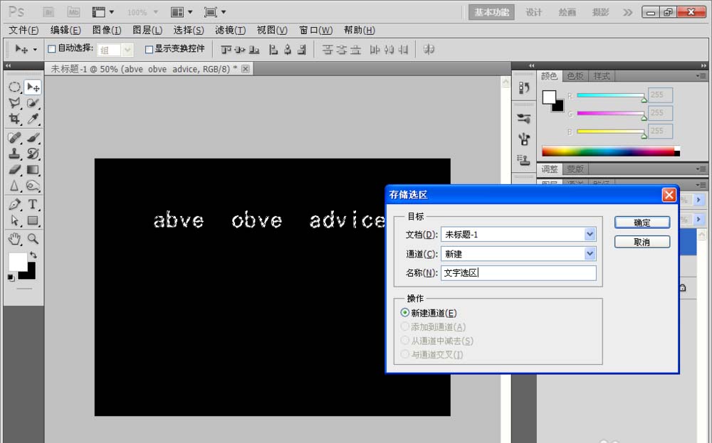2、输入横排文字,然后选择存储选区,新建一个文字选区的通道,点击确定
