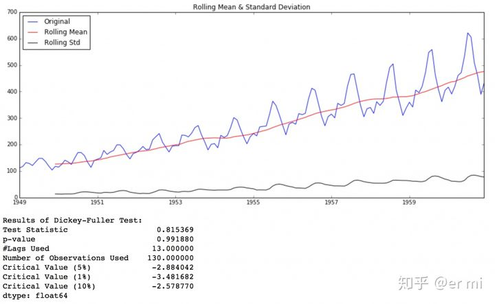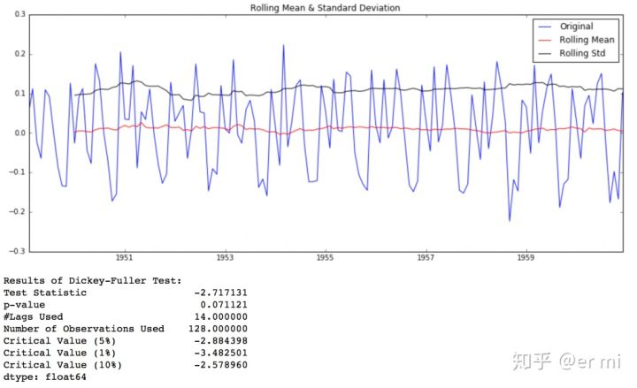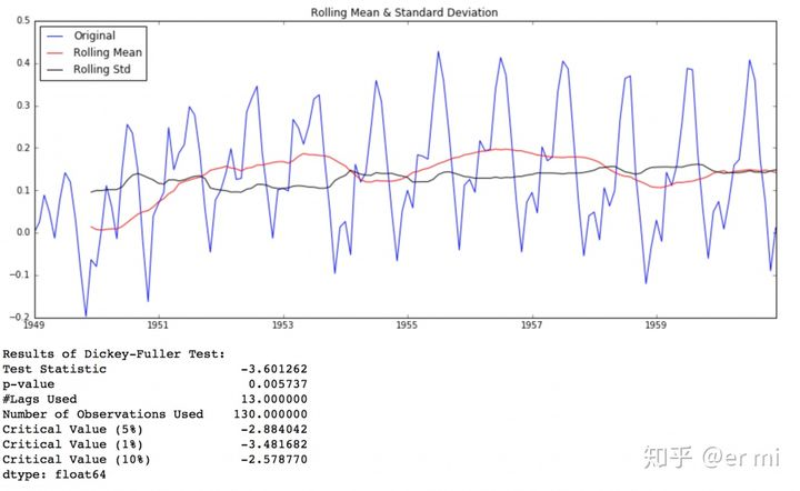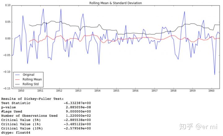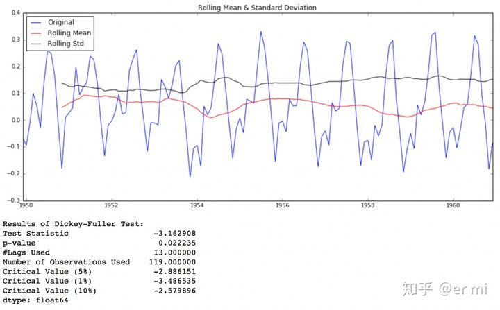 虽然标准差的变化很小,但随着时间的推移,均值明显增加,这不是一个平稳的序列。此外,测试统计量远远超过临界值。注意,正负值应该被比较,而不是比较绝对值。