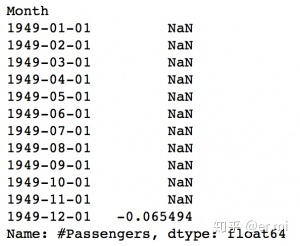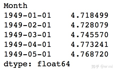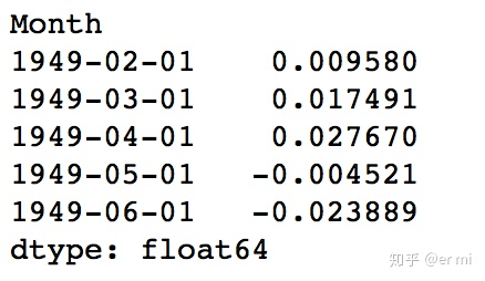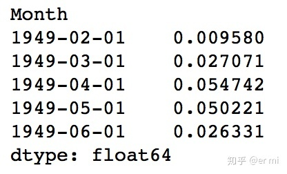 注意,这些是从‘1949-02-01’开始,而不是第一个月。为什么?这是因为我们将第一个月份取为滞后值,一月前面没有可以减去的元素。将差分后的区间转换为取对数后的区间的方法是这些差值连续地添加到基本值。(这句话就是想要回退差分)一个简单的方法就是首先确定现在区间的累计总和,然后将其添加到基本值。累计总和可以由下面得到: