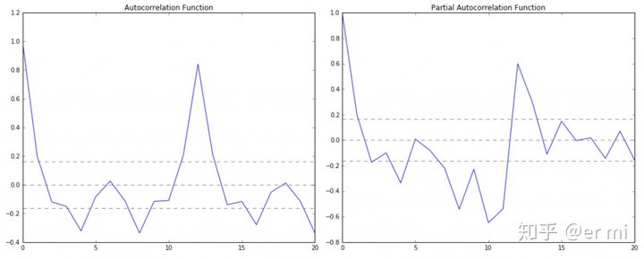 在这个图中,0旁边的两条虚线之间代表置信区间。这些可以用来确定“p”和“q”的值: