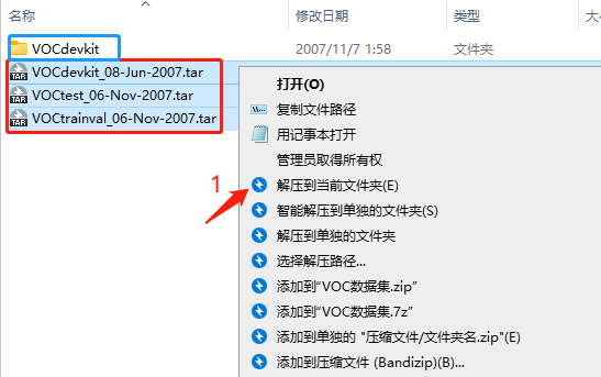 如下图所示,选中三个压缩包,然后解压到当前文件夹,会形成蓝色框标记的VOCdevkit文件夹