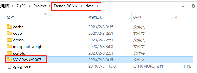 然后将文件夹名更改为 VOCDevkit2007 并移动至Faster-RCNN中data目录下。