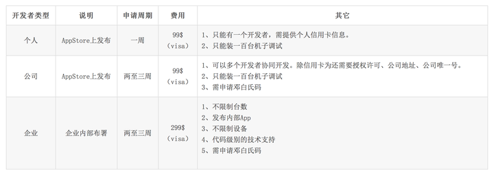 当然,说到这里,可能很多人对“企业签”是什么还不是很明白,只知道经“企业签名过的App”可以不受限制在用户的iPhone上安装。在此之前,我们先讲一下苹果开发者账号的三种种类和区别。