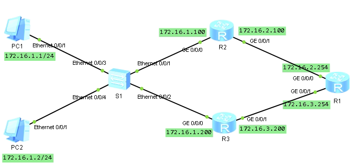 S1连接到公司出口网关,为提高网络可靠性,公司使用两台路由器R2和R3连接到接入商路由器R1。