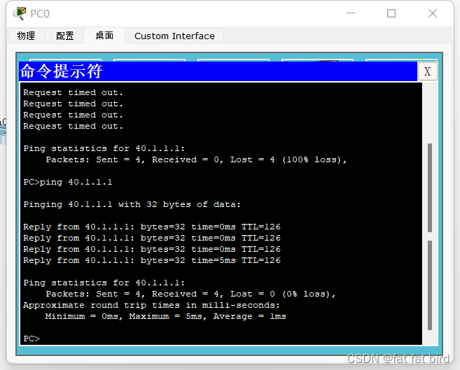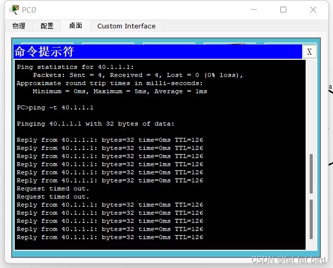 注:实验过程初步ping测试中时常会丢包,一般第一次4个包不通,可以选择再ping一次