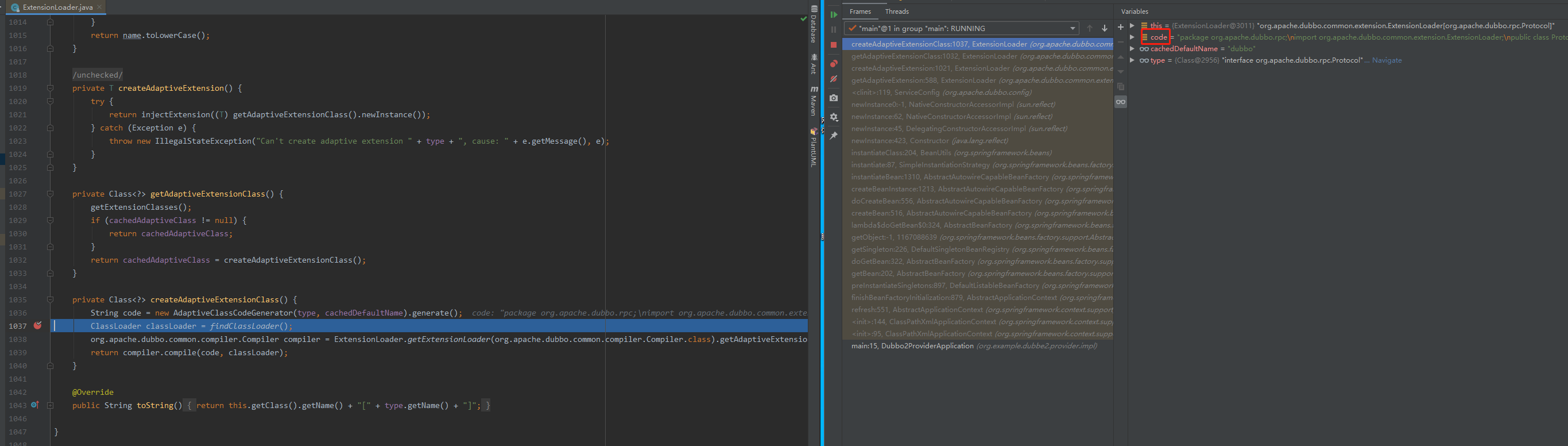 在调用ExtensionLoader.getAdaptiveExtension()方法时,会执行createAdaptiveExtensionClass()方法动态生成Protocol$Adaptive和ProxyFactoryAdaptive类。在createAdaptiveExtensionClass()代码中增加断点,启动程序执行到断点处,查看code的值,如下图所示。