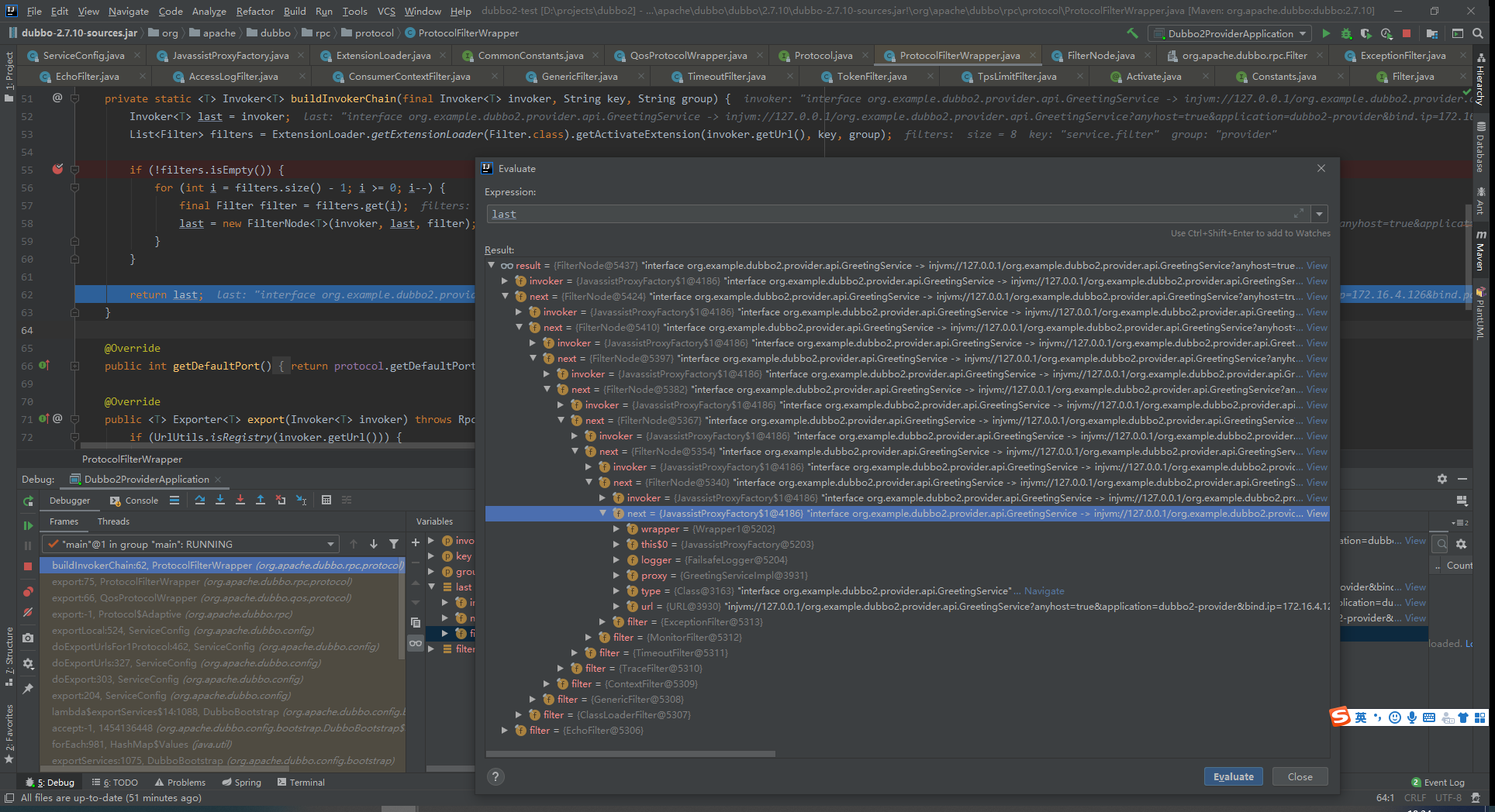 以上就是凶狠冰淇淋最近收集整理的关于Dubbo源码阅读六:Dubbo动态生成的类第1节 Dubbo动态生成的类第2节 Protocol$Adaptive类第3节 ProxyFactory$Adaptive类第4节 ProxyFactory Extension实例第5节 Wrapper子类第六节 Protocol Extension实例第七节 Filter Active Extension实例的全部内容,更多相关Dubbo源码阅读六:Dubbo动态生成的类第1节内容请搜索靠谱客的其他文章。