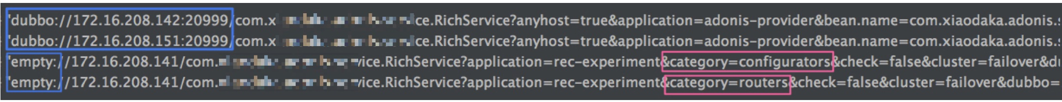 [providers,configurators,routers] = [/dubbo/com.nini.adonis.service.RichService/providers,/dubbo/com.nini.adonis.service.RichService/configurators,/dubbo/com.nini.adonis.service.RichService/routers]