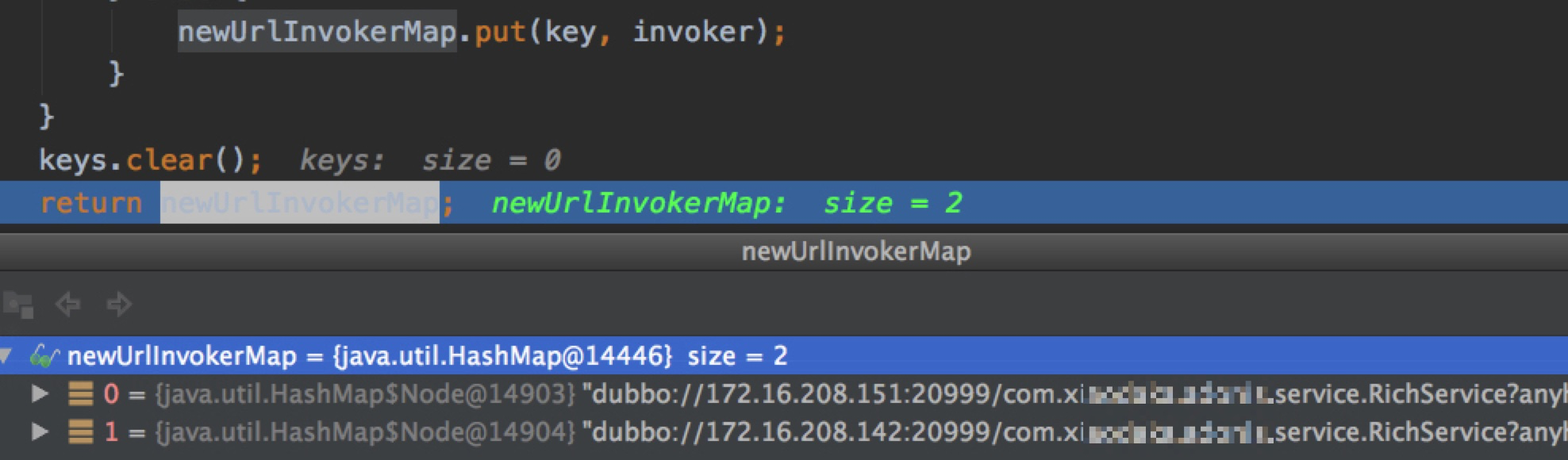 3.4 遍历每一个provider url 循环!org.apache.dubbo.registry.integration.RegistryDirectory#toInvokers 最终 Map<String, Invoker<T>> newUrlInvokerMap 如下