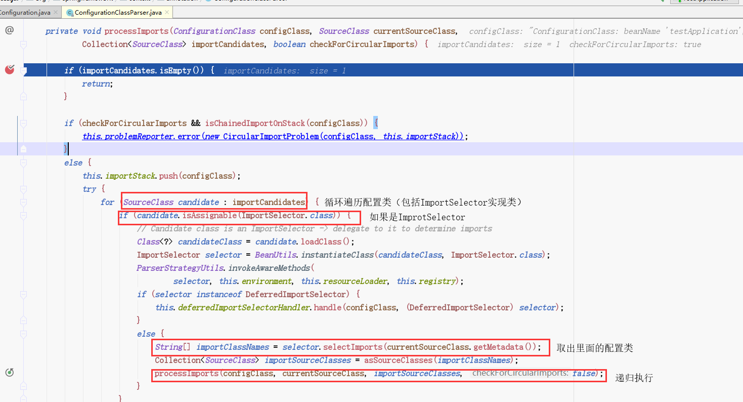 我们在这打一个断点就能够看到取到了,他首先会递归的获取我们自定义导入的配置类的信息。