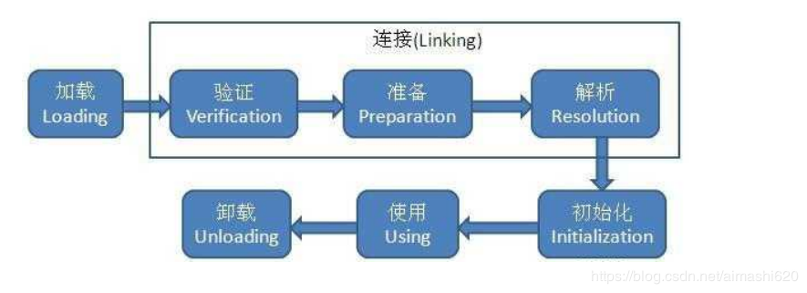 1. 加载:通过这个类的全限定名找到这个类所在的位置,把它从一个文件或者一个字节流转化为虚拟机内存中的一个确确实实的对象。