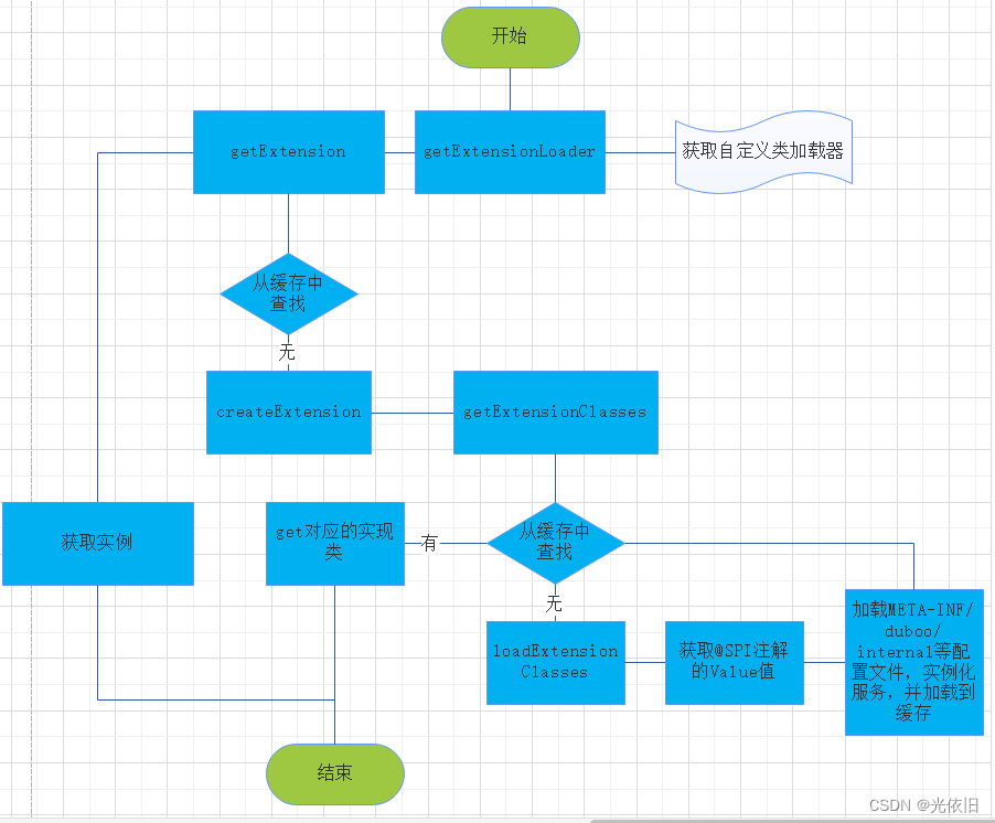 最后,duboo spi的主要流程如下图,当中ExtensionLoader与ServiceLoader类似,封装了duboo的spi实现逻辑,大家可以从该类的源码入手,根据给出的流程图去体会下其编码思想。