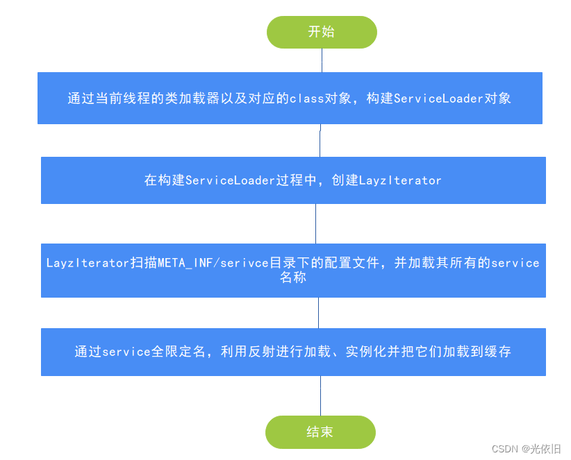 Java 实现SPI的核心类是ServiceLoader,通过它加载类加载器,然后创建LazyIteator(用于扫描Meta-INF/services,这个目录下所有配置文件并解析文件中配置的服务名),最后通过反射的方式把服务名对应的类进行加载,完成实例化后将它们加载到缓存中。