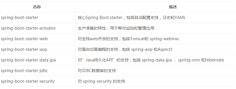 下面是Spring Boot在 org.springframework.boot 组下提供的一些Starters:
