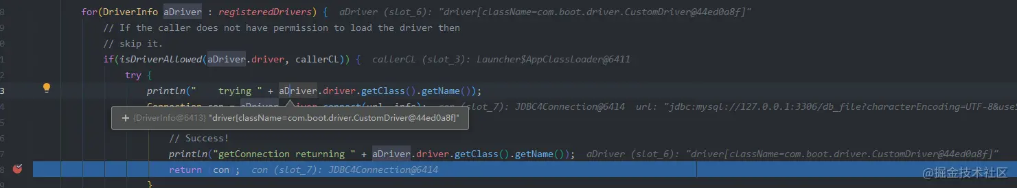 需要注意的是 CustomDriver类需要实现继承 NonRegisteringDriver类,否则会被默认的Driver优先注册,完成之后使用上古的JDBC代码调用,即可模拟破坏SPI的情况,如图: