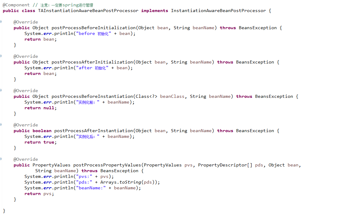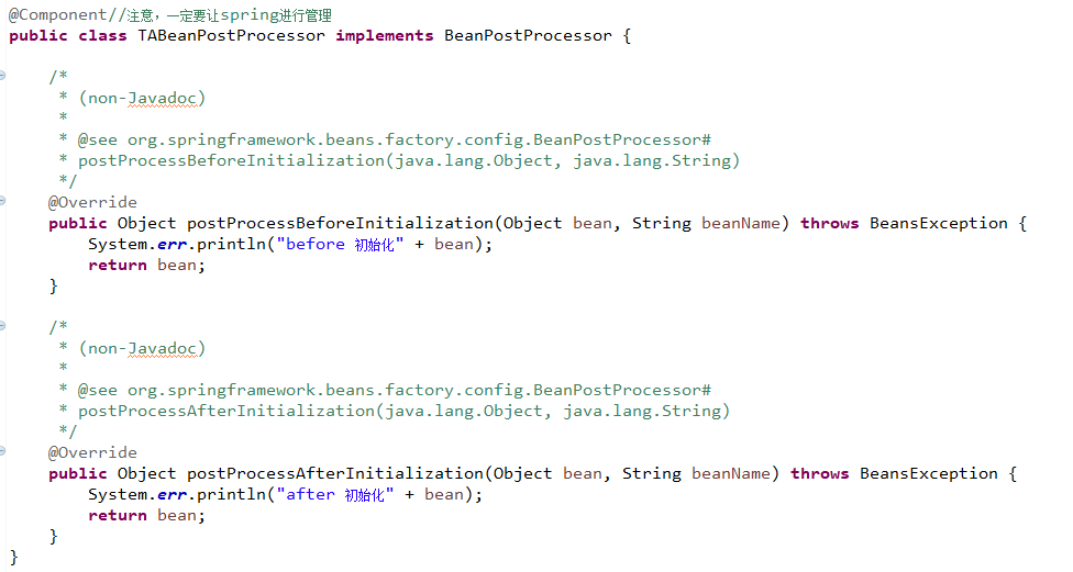 如果想在系统中的所有(或者部分bean)初始化前后,做些事情,可继承该接口,使用方式如下图示例: