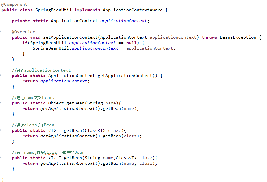 针对bean工厂,可以获取上下文,可以获取当前bean的id。这三个接口都继承自 Aware 接口,并分别定义了自己的接口定义方法。实现这些接口就能得到Spring的Bean 工厂、以及应用上下文等信息。从而调用getBean方法获取Bean。很多项目中都使用此接口做为Spring的工具类。比如可以像这么使用: