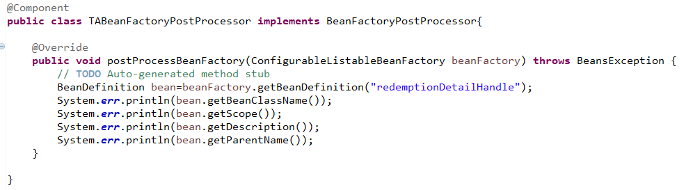 所有的bean定义都已经加载了,但是还没有实例化bean。这允许覆盖或添加属性,甚至是对初始化bean的属性。参数是什么呢?应用程序上下文所使用的bean工厂。也就是说,我们可以获取某个Bean的定义,然后修改该Bean的定义:比如下面这样: