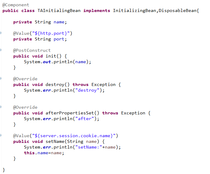 执行顺序为:setName、init、afterPropertiesSet,如果和前面的TAInstantiationAwareBeanPostProcessor结合起来,则顺序为: