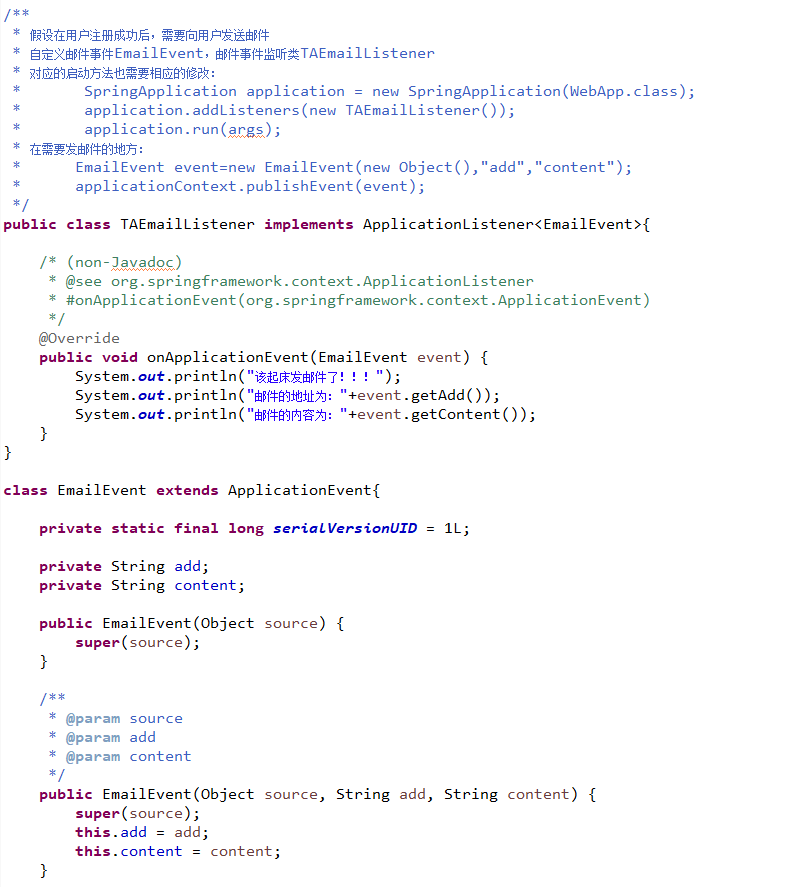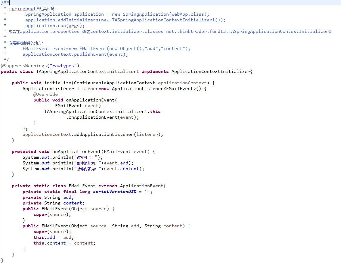 假设在用户注册成功后,需要向用户发送邮件时,也可以使用springboot的事件监听,详情可参考另外一篇博文springboot生命周期和监听器。代码如下: