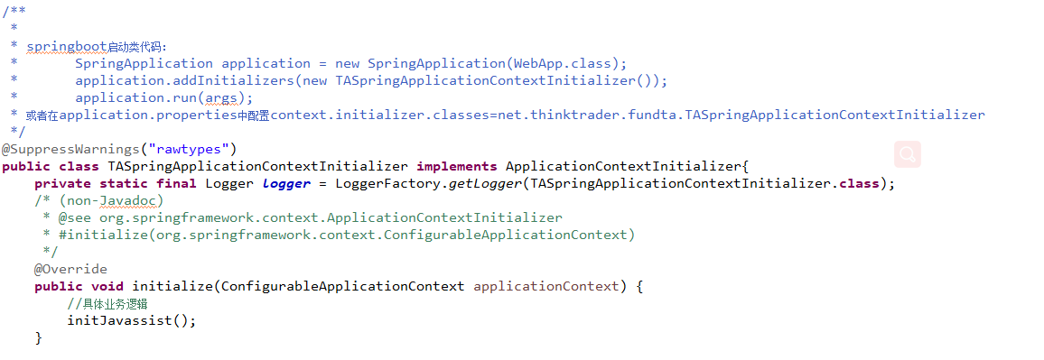 应用初始化器,在ApplicationContext做refresh之前(prepareContext时),允许我们对ApplicationContext的实例做进一步的设置或者处理。详情可参考另外一篇博文springboot应用上下文初始化器。最近在项目中有这么个需求,项目在重构时,需要对某个包下的大多数类的大多数方法进行验证,即在进入这些类的这些方法时,执行一个验证,如果验证不通过则抛出异常。解决方案是在项目中使用javassist动态字节码技术实现AOP前置操作,但如何将这个验证的AOP代码在springboot启动时(在bean加载前)引入spring呢,就是通过自定义initializer实现的。