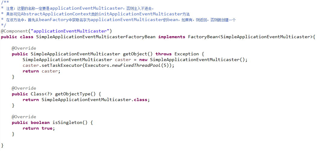 这样,就相当于想spring容器注入了一个bean,其名字为applicationEventMulticaster,类型为getObjectType返回的类型,并且是单例。
