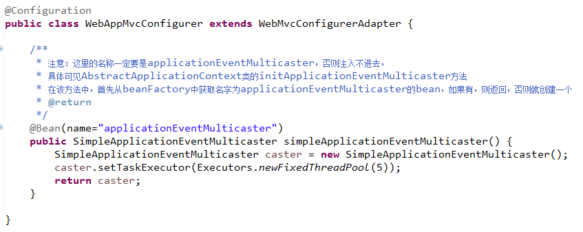 在一个被@Configuration修饰的类中,通过@Bean修饰一个方法,方法的返回类型为要注入类的类型。这样也能对spring注入了一个叫applicationEventMulticaster的bean,其类型为SimpleApplicationEventMulticaster。