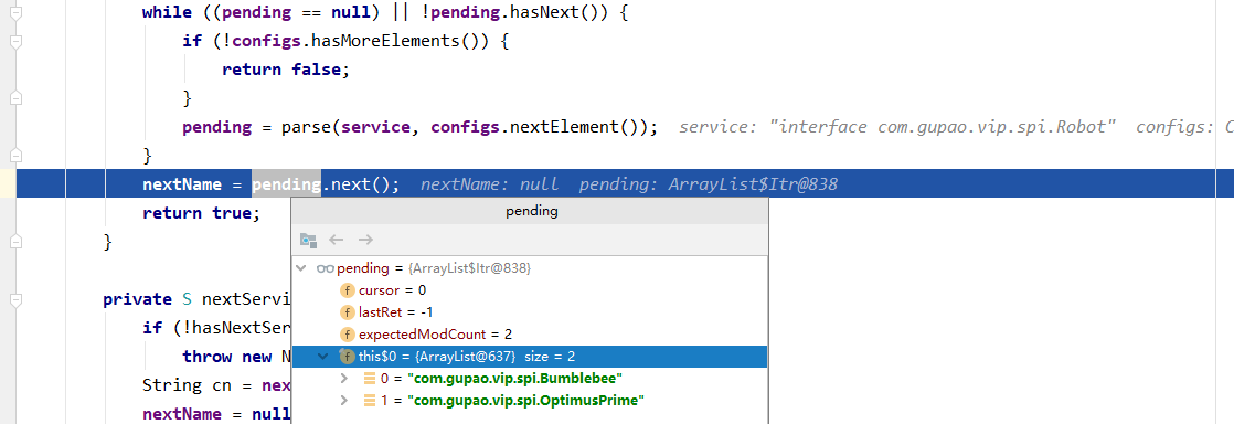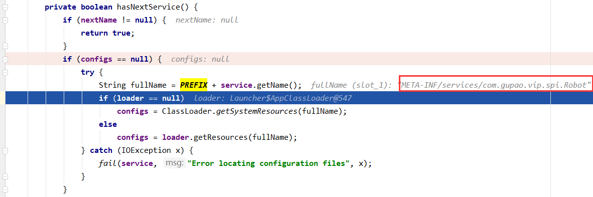 public class Test { public static void main(String[] args) { ServiceLoader<Robot> serviceLoader = ServiceLoader.load(Robot.class); System.out.println("Java SPI"); serviceLoader.forEach(Robot::sayHello); } }Java SPI Hello, I am Bumblebee. Hello, I am Optimus Prime.4.验证原理,此处配置了扫描的路径前缀。特别提醒下,文件路径一定要配对,不然检索不到。