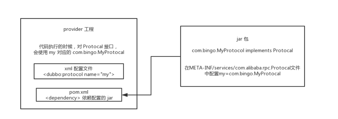 它会去找一个你配置的 Protocol,将你配置的 Protocol 实现类,加载到 jvm 中来,然后实例化对象,就用你的那个 Protocol 实现类就可以了。这这里就是根据"my"这个关键字去找到对应的Protocol的实现类。