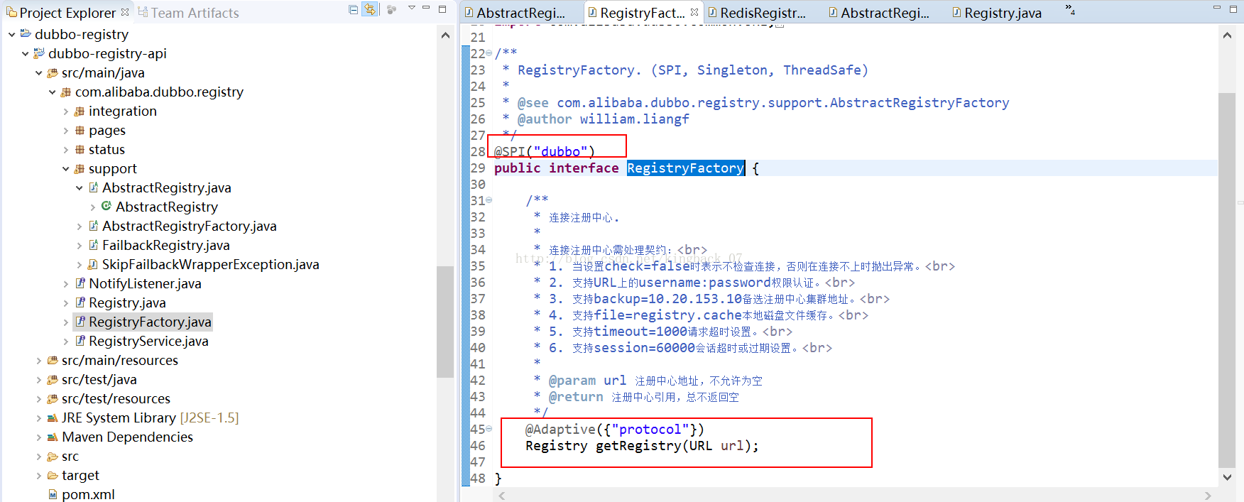 dubbo-registry-api作为dubbo registry层的框架层提供RegisryFactory为上下层返回对应的Registry实例进行上下层的程序流动,而通过SPI的方式提供了各种注册中心的支持,这样保证原框架结构不发生变化的情况下活性的扩展了多种服务注册中心的支持。