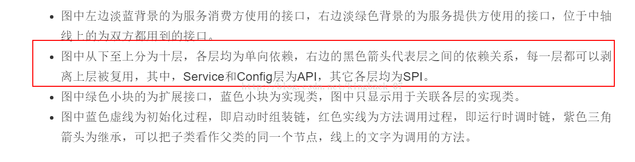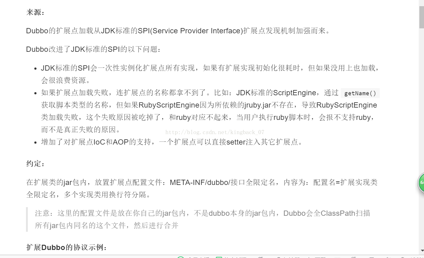SPI(Service Provider Interface),服务提供者扩展标准的接口,调用者可以通过提供SPI接口的具体实现完成调用者的"定制化"开发工作,不同于API(Application Programe Interface),调用者调用API为了实现某功能,SPI采用模板方法的设计模式,在API设计中定义一个SPI接口,第三方使用此接口时可在META-INF下定义一个以接口全名命名的文件,文件内容为第三方扩展此接口的文件名全称(加载时通过classpath自动加载对应的实现类),这样要求调用者提供具体实现来完整SPI接口提供方的功能。dubbo的开发设计除了在Service层和Config层采用的API方式,其他层面均采用SPI定义接口,采用此方式以Ioc的机制将api接口实现的一些细节交给实际调用者实现,框架变的可扩展而核心部分保持稳定。