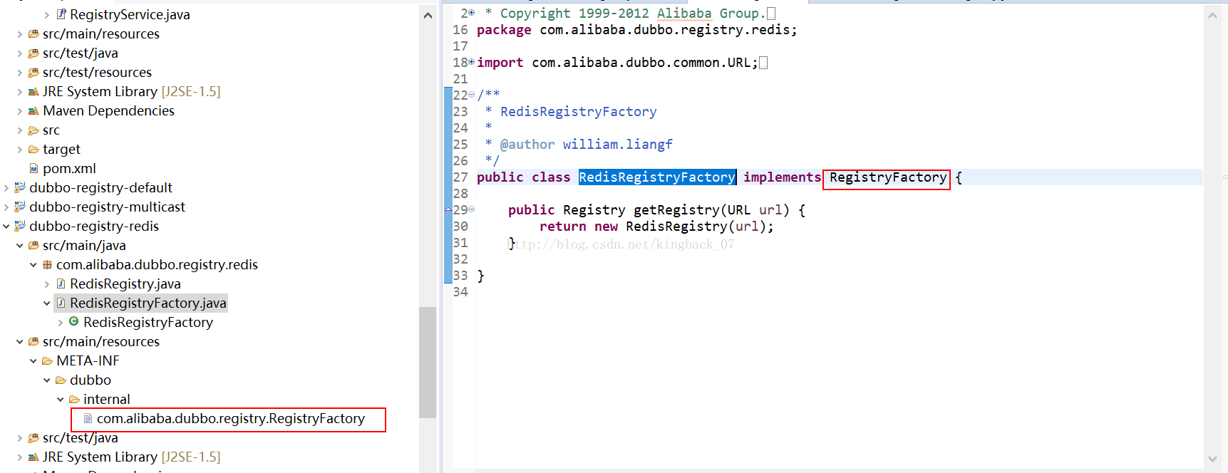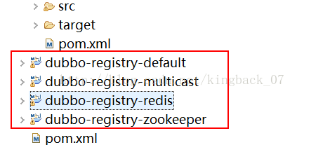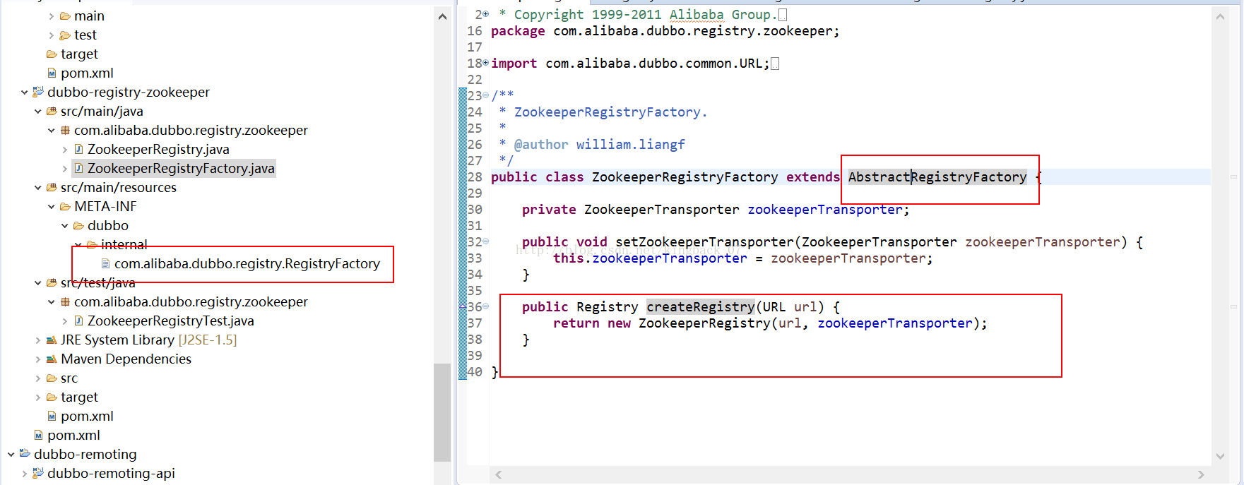 四个不同类型的注册中心实现可以看作四个服务厂商,分别看dubbo-registry-redis源码和dubbo-registry-zookeeper源码的实现,对应的工厂类实现方法