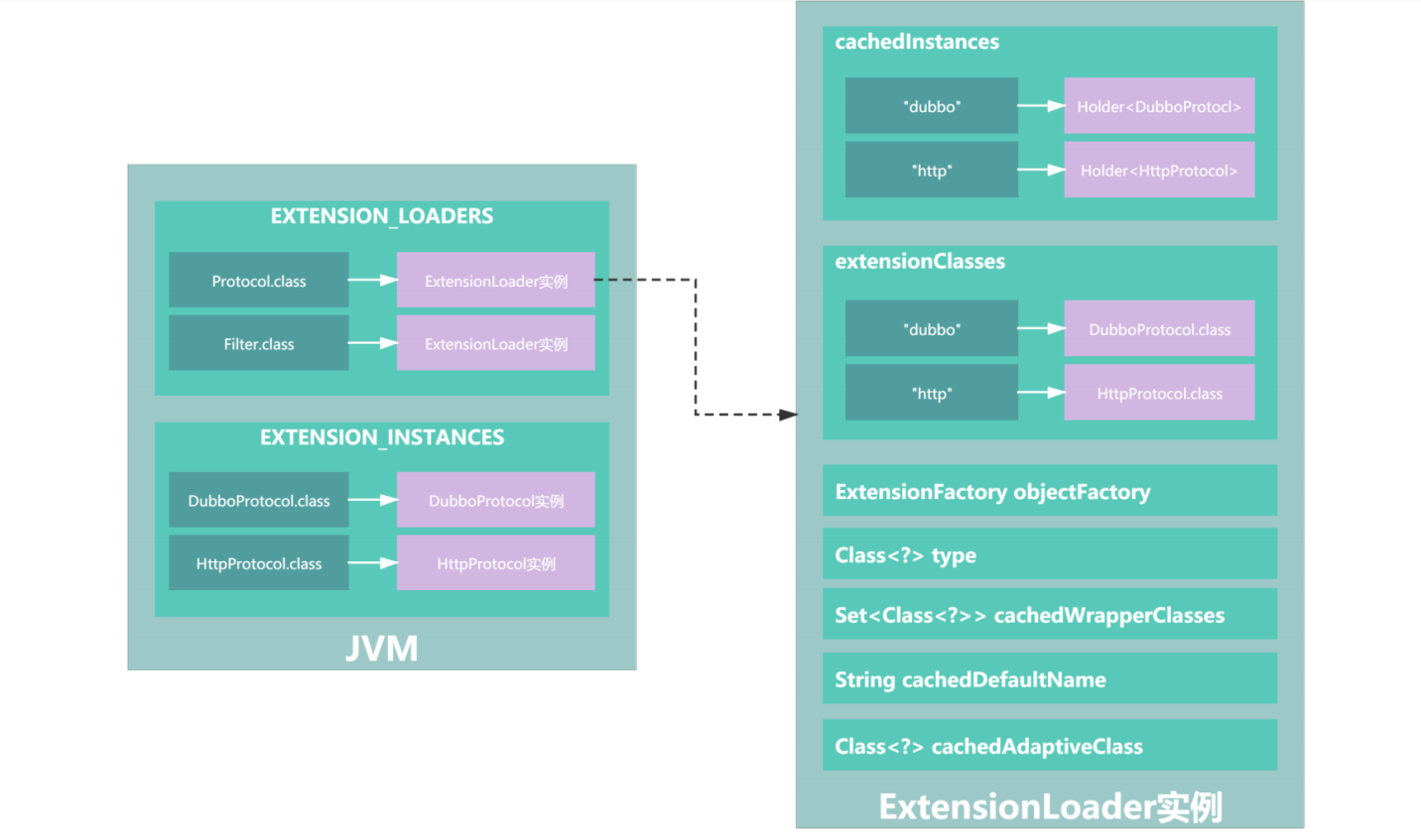 在ExtensionLoader类的内部有⼀个static的ConcurrentHashMap,⽤来缓存某个接⼝类型所对应的