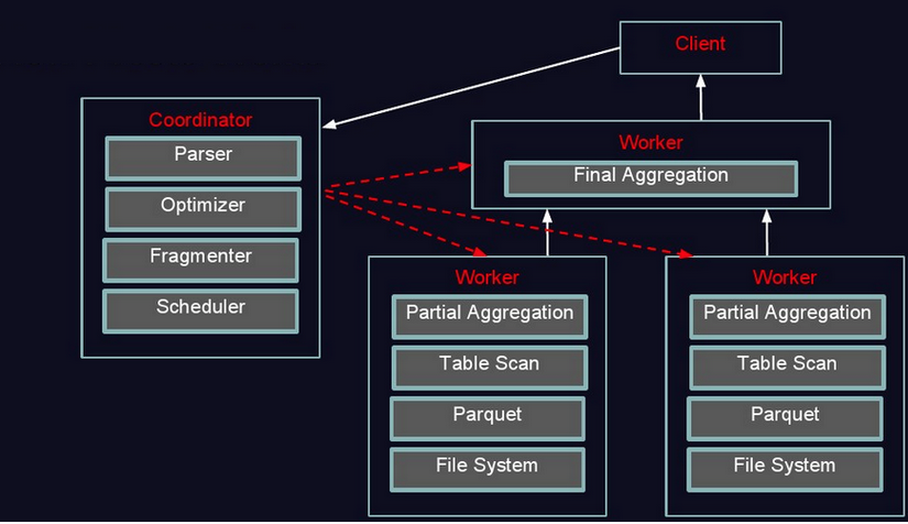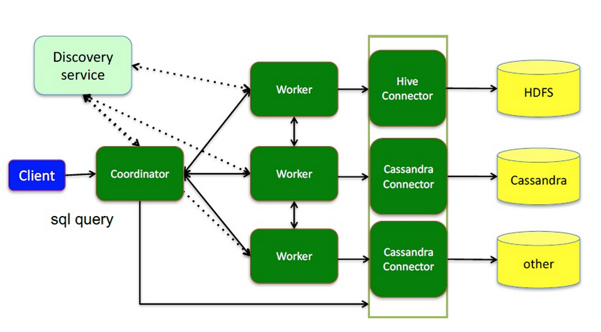 4.discovery service:内嵌在coordinator节点中,也可以单独部署,用于节点心跳;worker节点启动后向discovery service服务注册,coordinator通过discovery service获取注册的worker节点