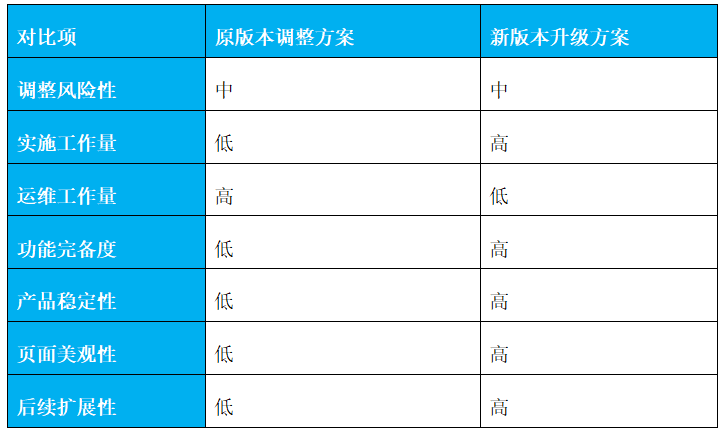 对于一个已经运维很长时间的项目,在做调整时,一定要下意识考虑运维边界的问题。如果是调整产品方面的,要优先考虑产品升级。因为旧版本基本已经停止运维,有些功能已经被新版替代,如果在旧的版本上做调整,间接导致的风险需要预防。而且对于升级来说可以走商务,变相推动后续项目的开展。