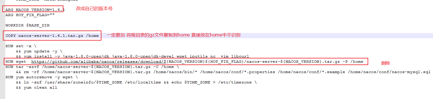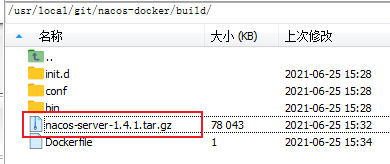 官方的Dockerfile意思是下载nacos的压缩文件,这里我们指定成本地我们已经打包好的gz文件。将其放到/usr/local/git/nacos-docker/build/路径下。(gz文件在上文可以找到。)