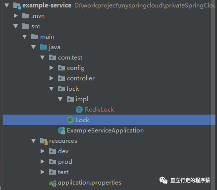 2,依旧以我们的example-service项目为例。创建lock包和实现包impl,并创建接口Lock和接口实现LockImpl,目录结构如图。