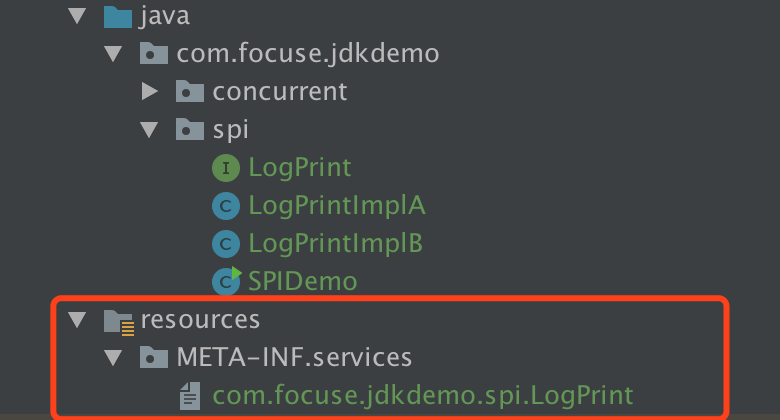 第三步,在目录META-INF/services下创建文件com.focuse.jdkdemo.spi.LogPrint,文件内容2行。