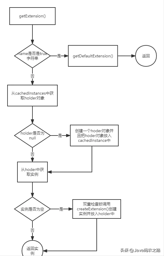 如果name是字符串true,那么会调用getDefaultExtension()方法获取默认的扩展点实例。否则会先从缓存holder中获取对应名称的扩展点实例,获取不到的话调用createExtension()方法创建扩展点实例并且放入到holder对象中缓存起来。这里我们重点对getDefaultExtension(),createExtension()两个方法进行分析。