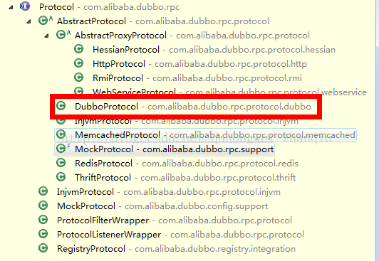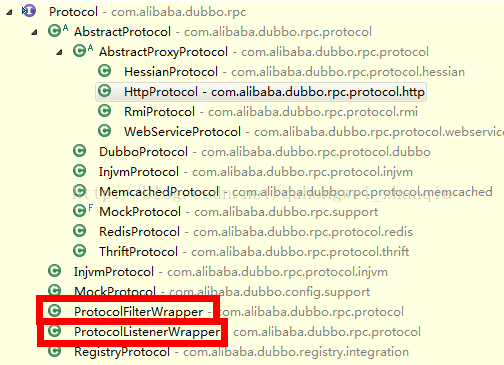 如图Protocol继承关系ProtocolFilterWrapper, ProtocolListenerWrapper这个两个类是装饰对象用来增强其他扩展点实现的功能。ProtocolFilterWrapper功能主要是在refer 引用远程服务的中透明的设置一系列的过滤器链用来记录日志,处理超时,权限控制等等功能;ProtocolListenerWrapper在provider的exporter,unporter服务和consumer 的refer服务,destory调用时添加监听器,dubbo提供了扩展但是没有默认实现哪些监听器。