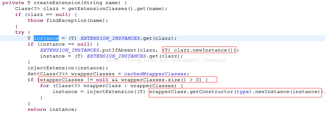 2)在调ExtensionLoader的createExtension(name)根据扩展点key创建扩展的时候, 先实例化扩展点的实现, 在判断时候有此扩展时候有包装类缓存,有的话利用包转器增强这个扩展点实现的功能。如下图是实现流程