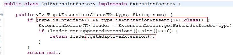 1) SpiExtensionFactory工厂获取要被注入的对象,就是要获取dubbo spi扩展的实现,所以传入的参数类型必须是接口类型并且接口上打上了@SPI注解,返回的是一个设配类对象。