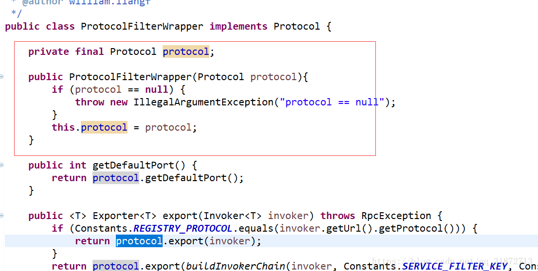 2.判断Registry的构造方法,观察构造函数中是否存在Protocol声明定义的变量,如果有则作为dubbo协议的包装类进行加载,如果没有则重新跳回1验证下一条记录filter。