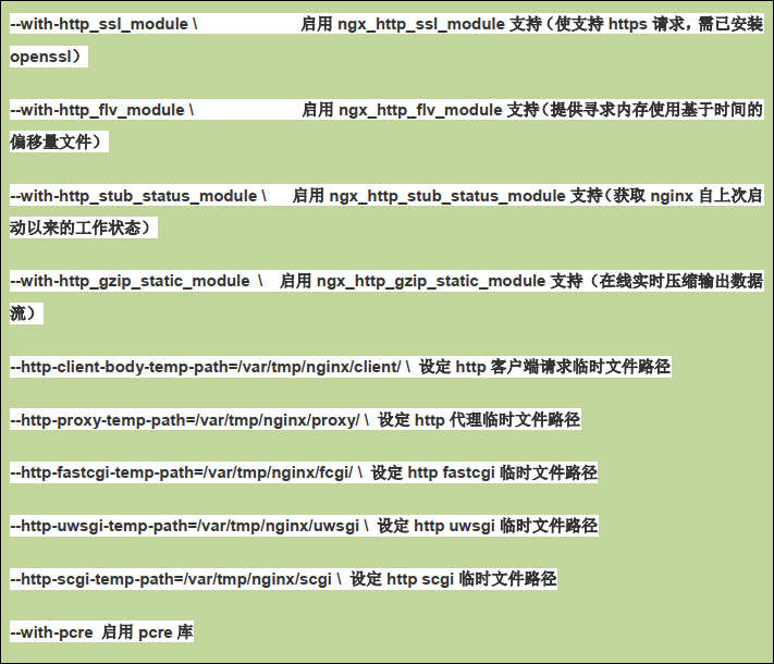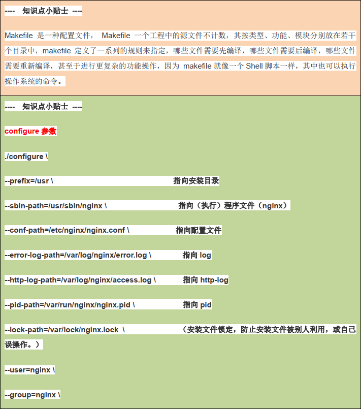 ./configure --prefix=/usr/local/nginx --pid-path=/var/run/nginx/nginx.pid --lock-path=/var/lock/nginx.lock --error-log-path=/var/log/nginx/error.log --http-log-path=/var/log/nginx/access.log --with-http_gzip_static_module --http-client-body-temp-path=/var/temp/nginx/client --http-proxy-temp-path=/var/temp/nginx/proxy --http-fastcgi-temp-path=/var/temp/nginx/fastcgi --http-uwsgi-temp-path=/var/temp/nginx/uwsgi --http-scgi-temp-path=/var/temp/nginx/scgi- 执行后可以看到Makefile文件