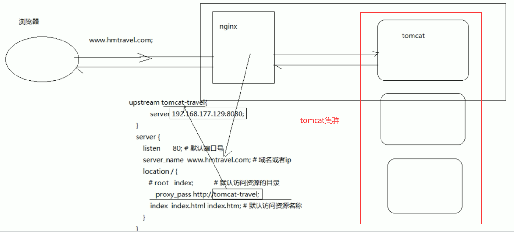 upstream tomcat-travel{ server 192.168.177.129:8080; } server { listen 80; # 监听的端口 server_name www.hmtravel.com; # 域名或ip location / { # 访问路径配置 # root index;# 根目录 proxy_pass http://tomcat-travel; index index.html index.htm; # 默认首页 } }- 流程图: