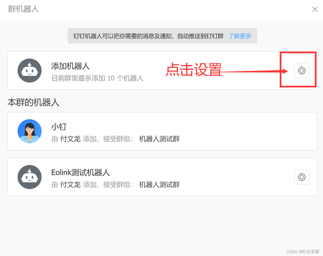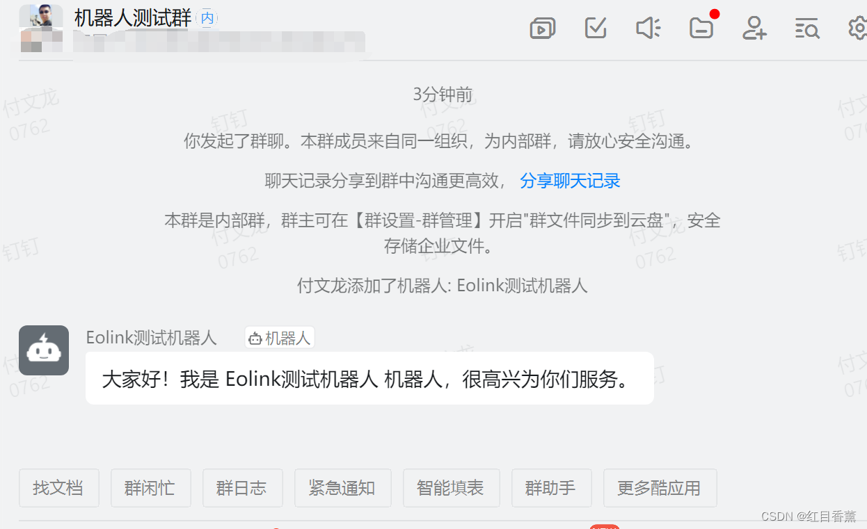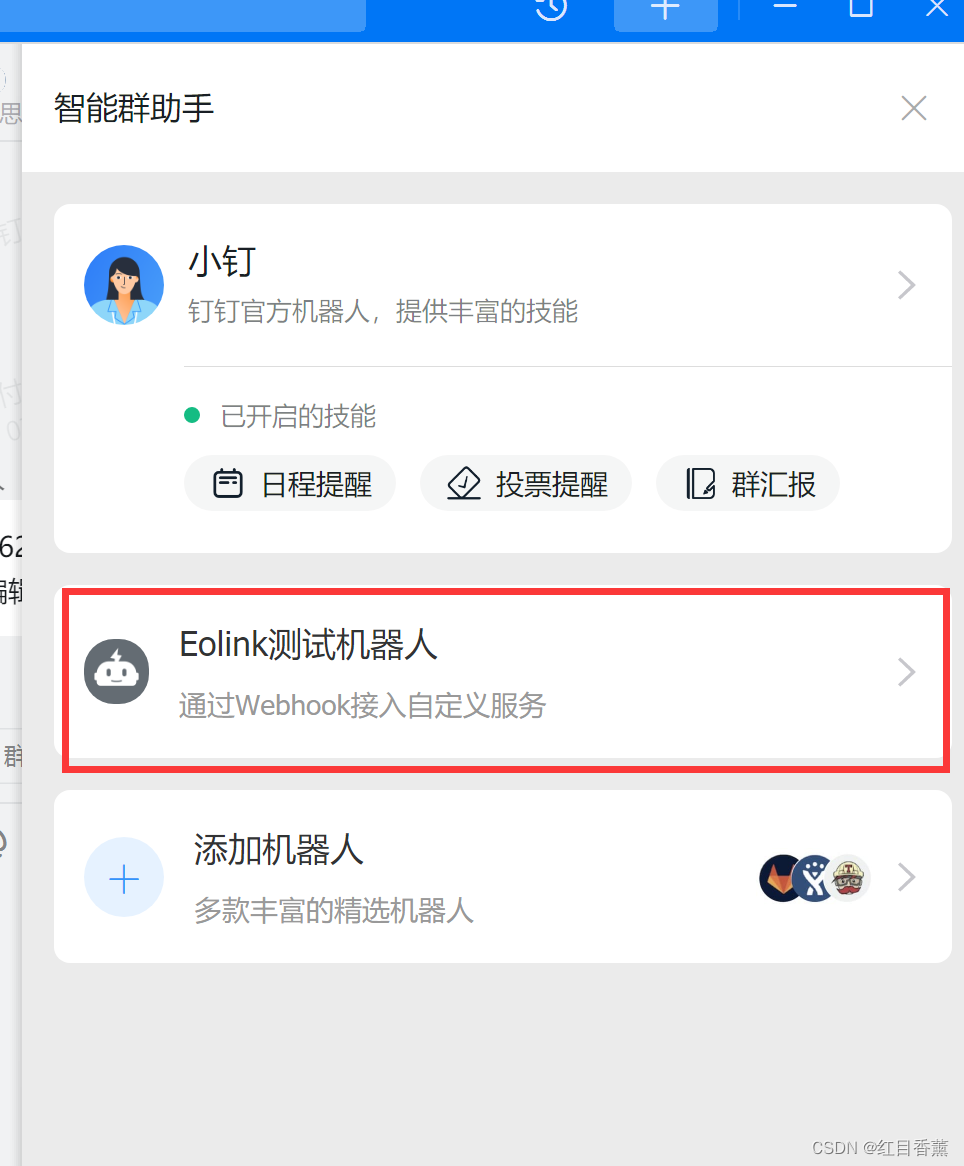 我已经有一个机器人了,我再演示一下,所以截图的时候有我的Eolink测试机器人。