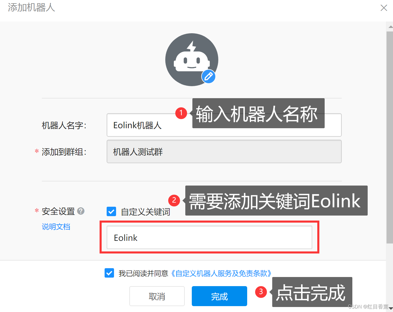 这里需要填写机器人的名称以及关键字,这里关键字需要填写【Eolink】,填写完毕后勾选阅读并同意,并点击完成。